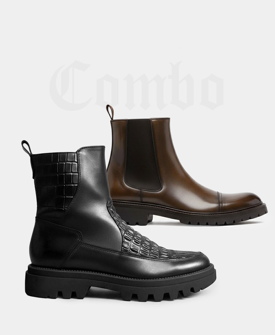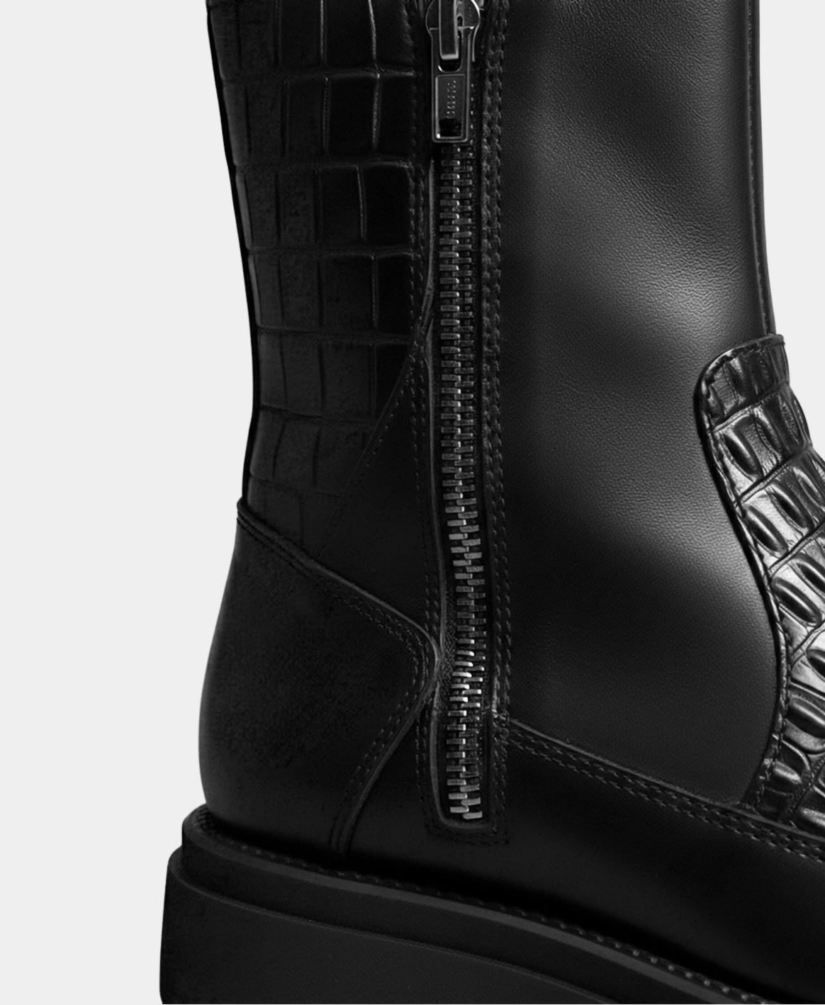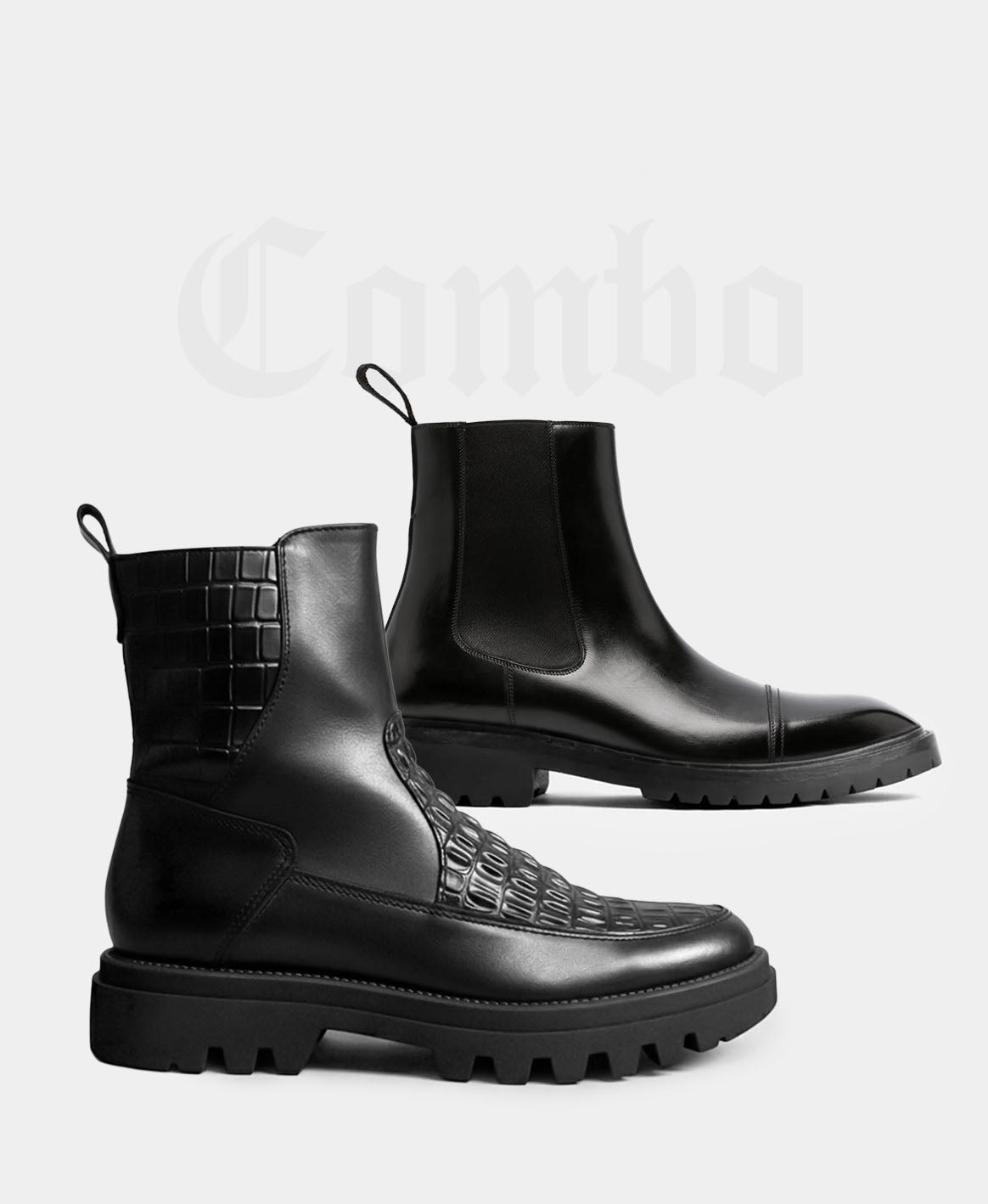 Botas negras de piel premium con grabado tipo cocodrilo, silueta imponente y suela robusta. Un modelo diseñado para destacar, proyectar seguridad y elevar cualquier outfit. Detalles finos, acabado impecable y presencia total.