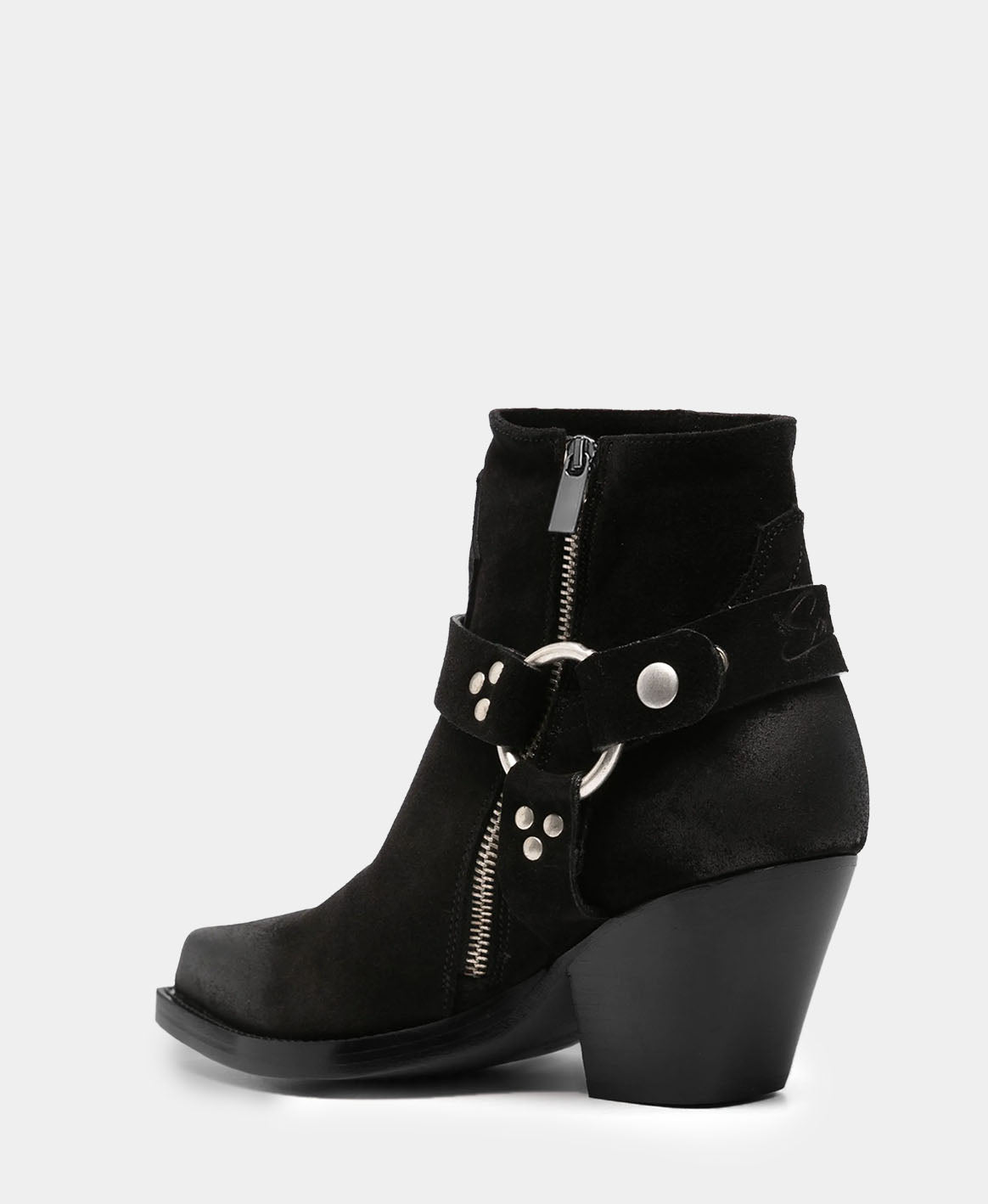 Botines de silueta estilizada con tacón robusto, arnés con argolla metálica y detalles de remaches que elevan cualquier outfit. Diseñadas para mujeres que pisan fuerte, que combinan carácter con sofisticación y que entienden que el estilo no se negocia.